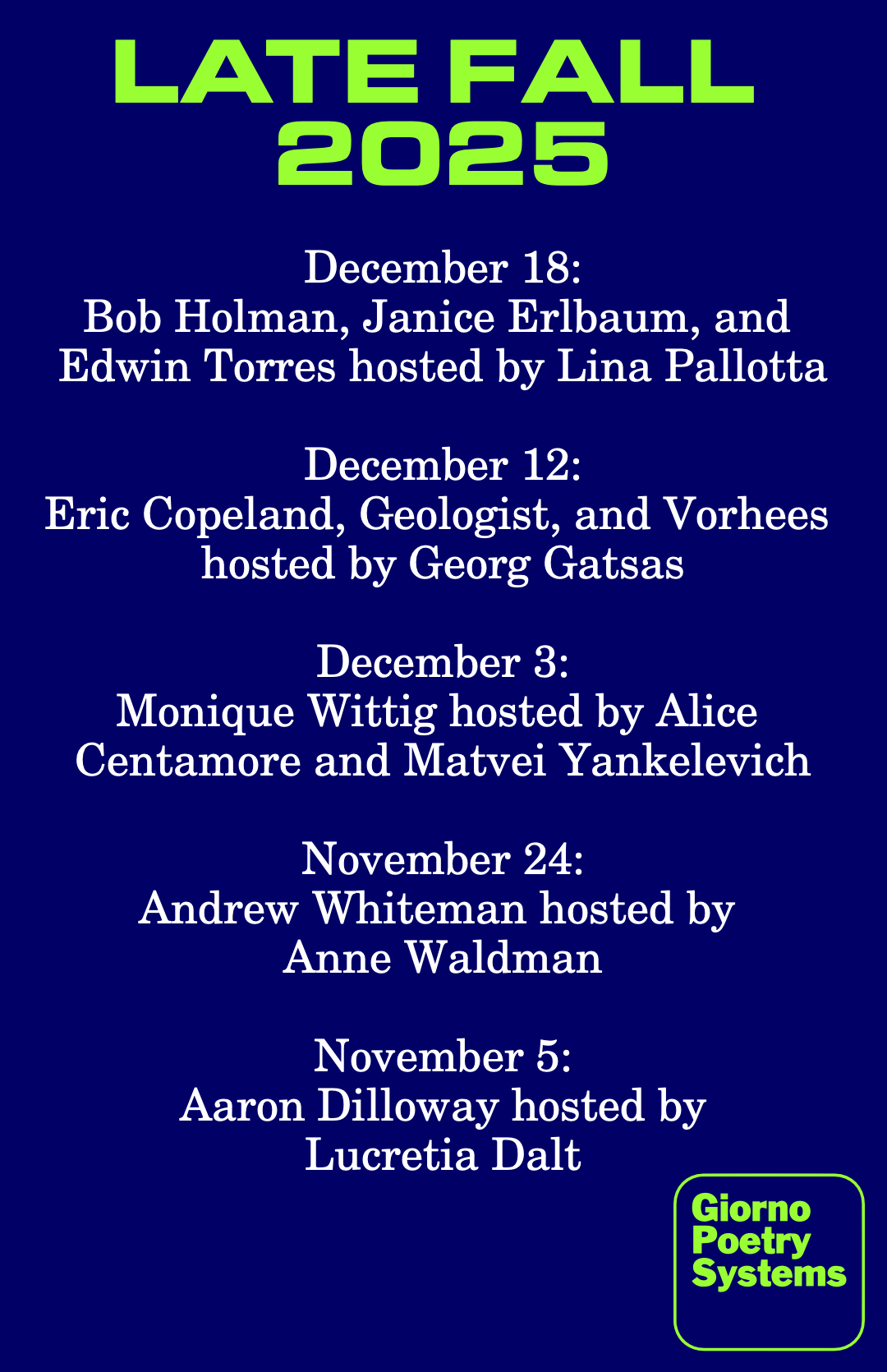 Lina Pallotta *reunites* Bob Holman, Janice Erlbaum, and Edwin Torres