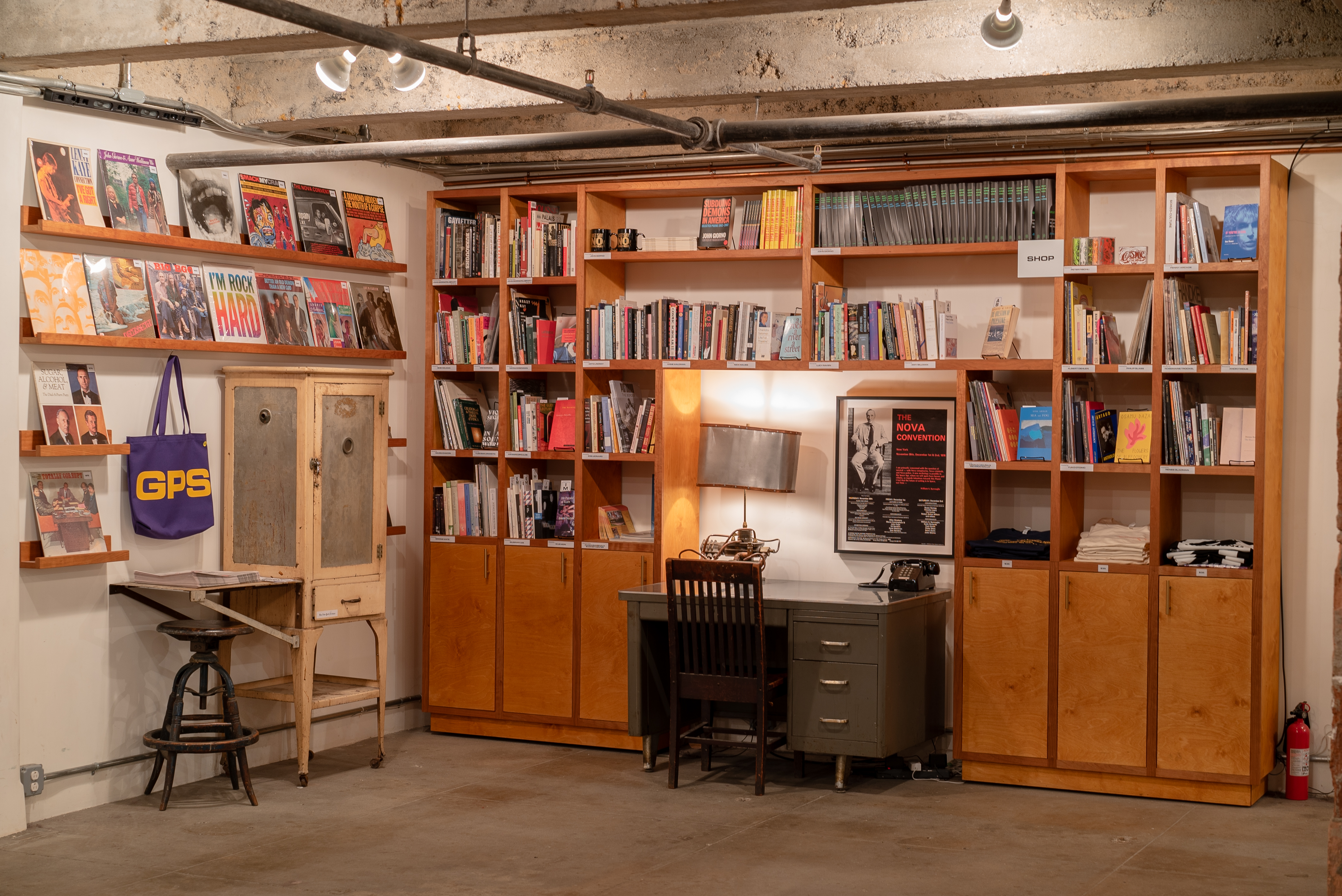 The Bookcase is an artist-curated shop. It contains books and LPs that have been selected by a group of artists, poets, and musicians. All are for sale, and whenever one is sold, we try to find another copy and maintain the same inventory. Obviously, the bookcase also contains John Giorno's own books, GPS merchandise, and all available releases from GPS Records.