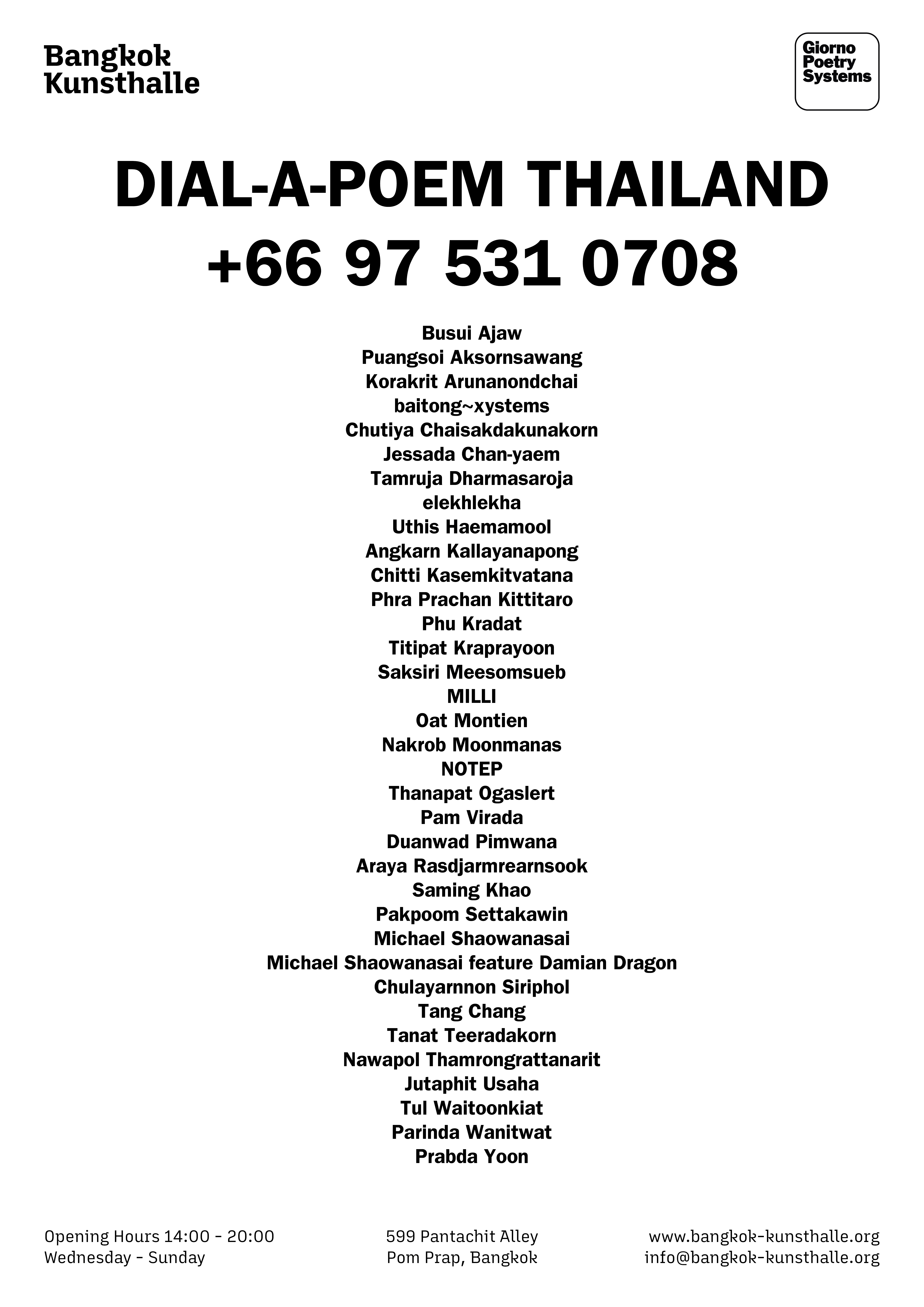 Dial-A-Poem Thailand features recordings by visual artists, poets, writers, musicians, filmmakers, a Muay Thai announcer, a street vendor, and a monk.